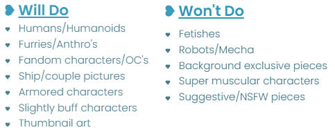 Icon $15 USD | Bust $20 USD | Half-body $24 USD | Full-body $30 USD